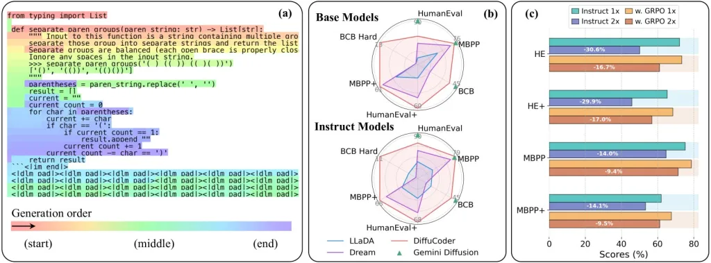 在主流编程跑分中,DiffuCode-7B-cpGRPO 保持了在生成代码时不严格依赖从左到右的生成方式情况下,相比较主流基于扩散的编程模型,测试得分提高了 4.4%。