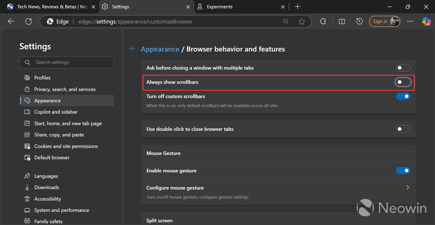 IT之家 7 月 5 日消息,科技媒体 NeoWin 昨日(7 月 4 日)发布博文,报道称微软为 Microsoft Edge 浏览器推出新功能,支持用户关闭自定义滚动条,改用统一的简洁滚动条,以减少视觉干扰。
