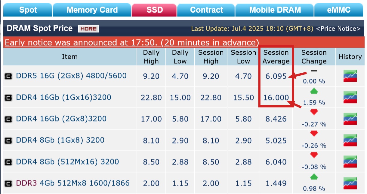 美光、三星和 SK 海力士于今年年初宣布,将在 2025 年底停止 DDR4 内存的生产;随后长鑫存储于今年 5 月也宣布跟进。受停产消息影响,DDR4 内存现货价格出现疯涨情况。