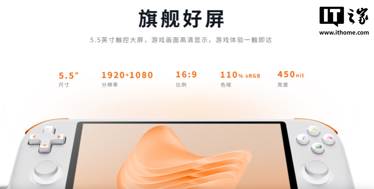 屏幕方面,该掌机搭载了一块 5.5 英寸的触摸屏,分辨率为 1920*1080,比例为 16:9,覆盖 110% sRGB 色域,最高亮度可达 450 尼特。