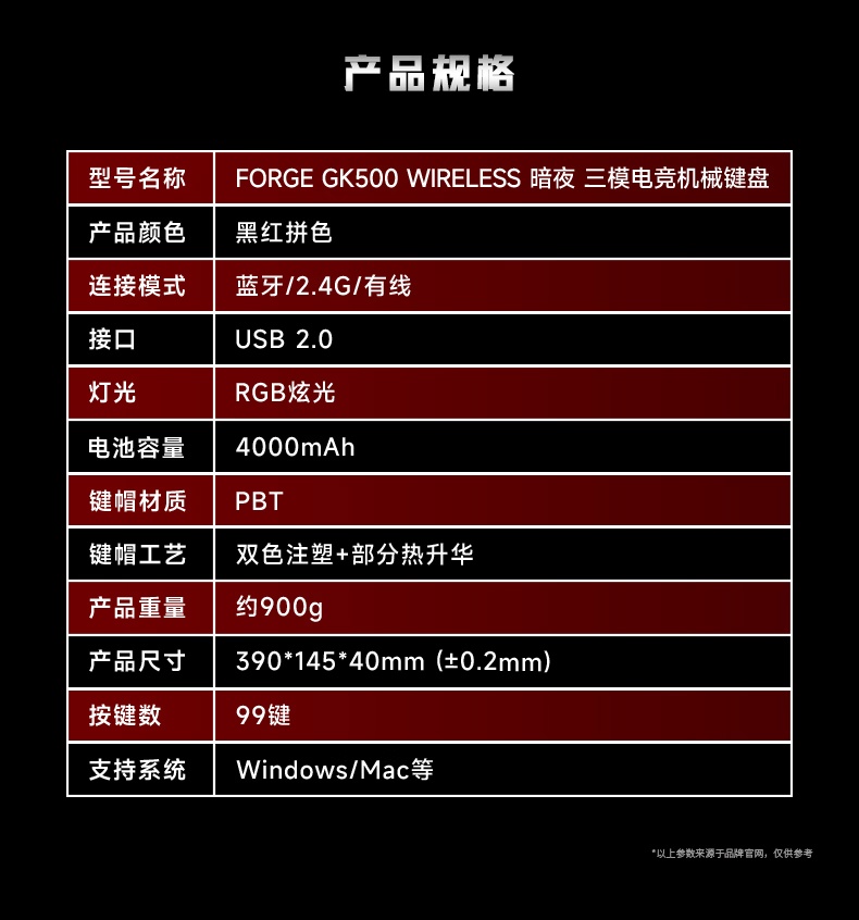 微星 FORGE GK500 W 暗夜支持 USB-C to A 有线连接、2.4G 无线、以及蓝牙三种连接方式,Type-C 数据接口位于键盘左侧,USB-C 转接线有弯头设计;内置 4000mAh 电池,2.4G 模式下续航时间约 230 小时,蓝牙模式下最高续航时间约 239 小时。IT之家附规格详情如下: