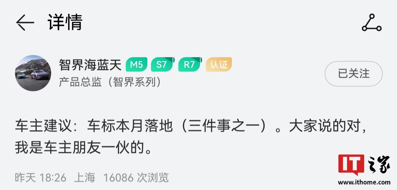 IT之家 7 月 6 日消息,智界系列产品总监 @智界海蓝天 昨晚在鸿蒙智行 App 宣布,车主的车标建议本月落地,并表示这是“三件事之一”(目前三件事未具体公开,当前仅知晓车标为其中之一)。