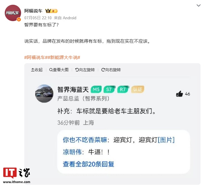 另外,根据网友 / 博主分享,智界系列产品总监 @智界海蓝天 还补充说明:“车标就是要给老车主朋友们。”