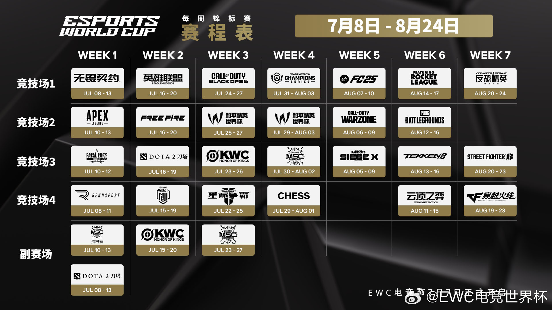 IT之家 7 月 6 日消息,2025 电竞世界杯(EWC2025)将于 7 月 7 日至 8 月 24 日在沙特阿拉伯利雅得举行,共有 24 个正赛项目。其中,《DOTA2》《无畏契约》将于 7 月 8 日率先开赛,《英雄联盟》将于 7 月 16 日开赛,《王者荣耀电竞世界杯》将于 7 月 15 日开赛。