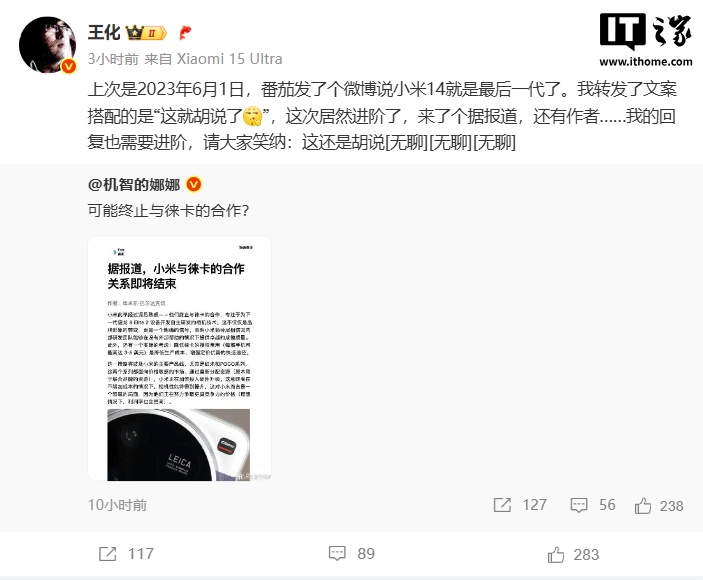 IT之家注意到,这并非小米与徕卡合作首次遭遇谣言。早在 2023 年 6 月,就有传闻称小米 14 系列将是双方合作的最后一款机型,当时王化便以“这就胡说了”直接辟谣。