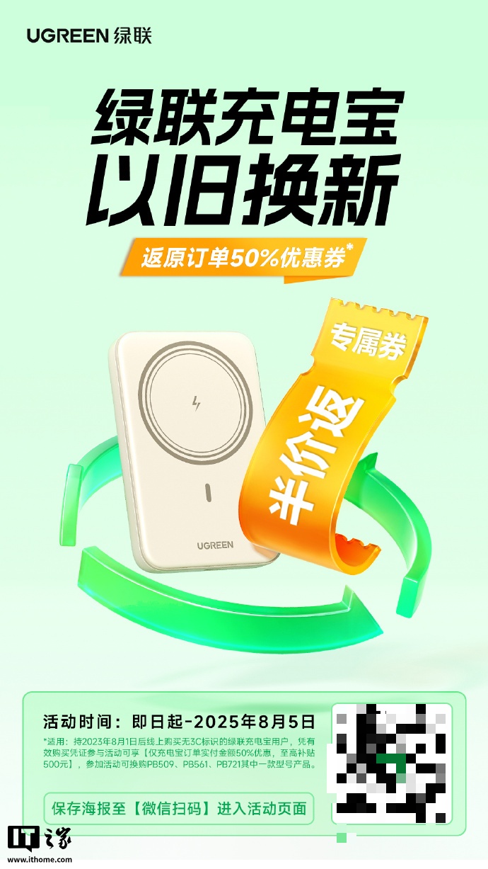 为此,即日起至 2025 年 8 月 5 日,绿联推出「充电宝以旧换新计划」。持 2023 年 8 月 1 日后线上购买无 3C 标识的绿联充电宝用户,凭有效购买凭证参与活动可享仅充电宝实付订单金额 50% 优惠(至高补贴 500 元),参加活动可换购 PB509、PB561、PB721 其中一款型号产品。换新产品通过国家 3C 强制认证及民航高铁最新携带标准,确保出行无忧。