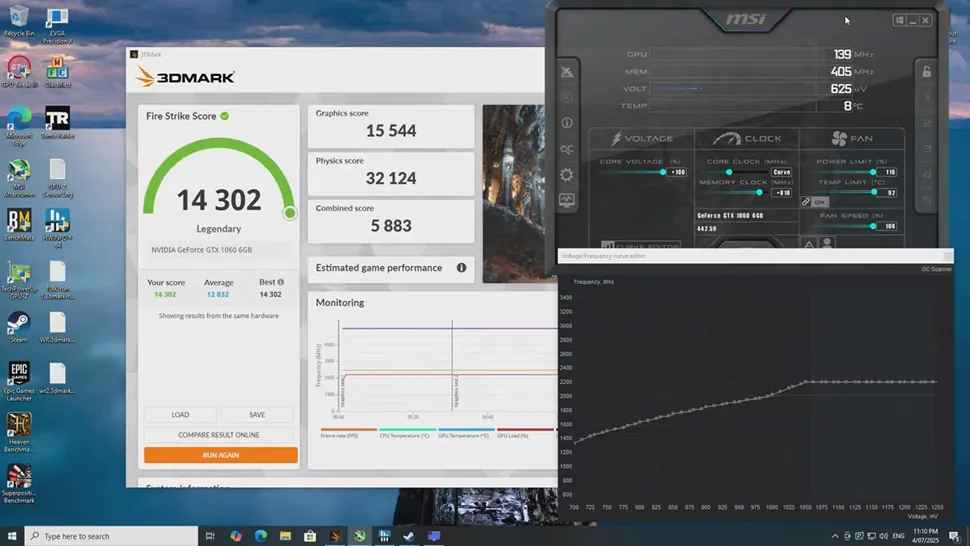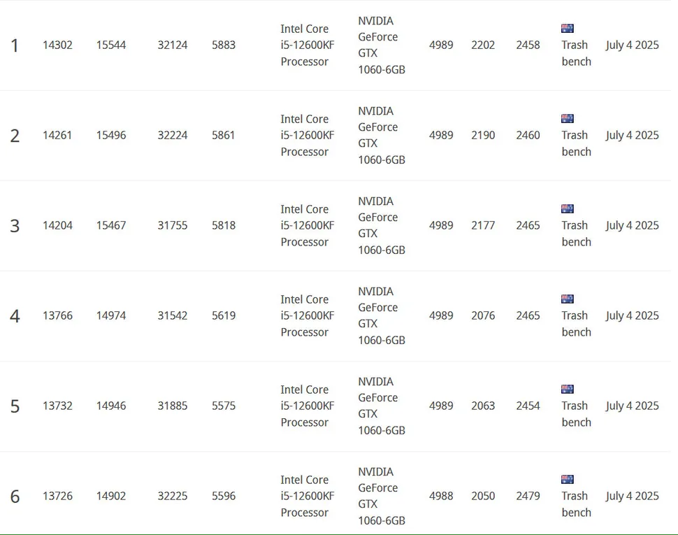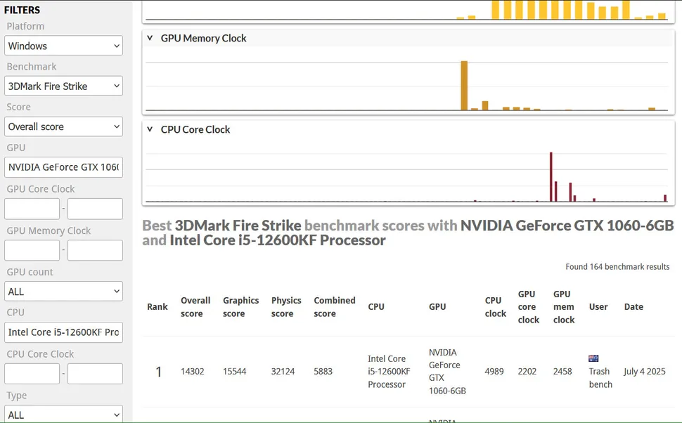 在完成 DIY 散热系统搭建后,TrashBench 通过 MSI Afterburner 软件逐步提升显卡的 GPU 频率,并实时监控温度。最终,他成功将显卡核心频率稳定在 2202MHz,并完成了完整的 3DMark Fire Strike 测试。这一成绩不仅使该显卡在搭载酷睿 i5-12600KF 处理器的系统中排名飙升至全球前五,还占据了 GTX 1060 类别中前六名的全部席位。