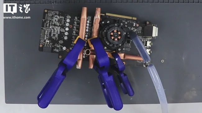 据IT之家了解,TrashBench 使用了一块华硕 GTX 1060 6GB 显卡,并使用了其原始 BIOS 和默认电压。他从一家家居 DIY 商店购买了多种长度的铜管,并将其切割、调整后,放置在显卡 PCB 的关键发热区域(如 VRM 和显存模块)上,用 G 型夹固定。随后,他为显卡安装了水冷散热块和水泵,并将铜管接入水冷循环系统,使用一个装满冰水的大桶作为冷却液储液器。