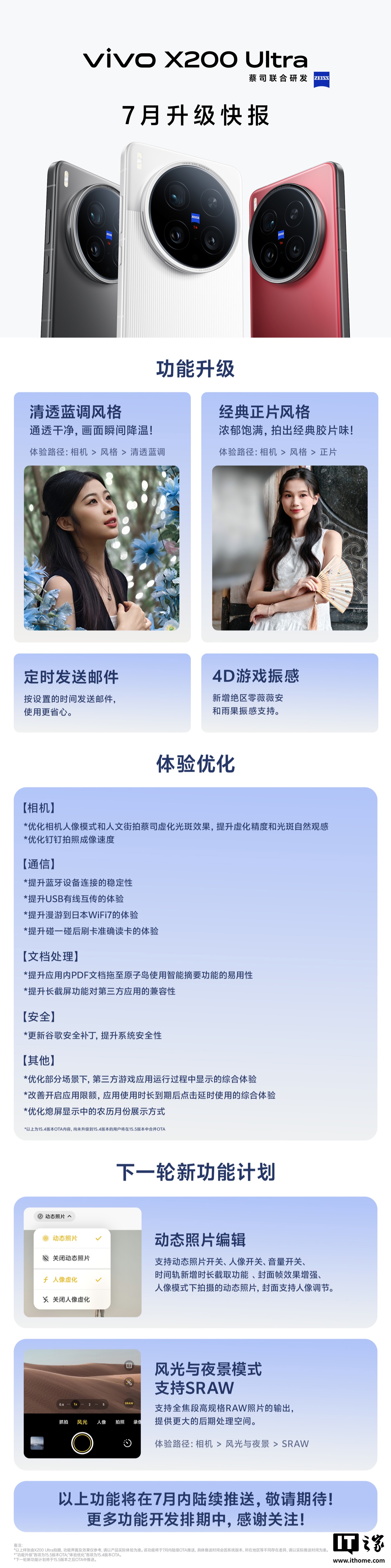 IT之家 7 月 7 日消息,vivo 官方昨日晚发布了 vivo X200 Ultra 手机 7 月份升级速报,该机本月新版本将更新全新相机风格、4D 游戏振感等,同时还有拍摄效果、性能通信等多项体验深度优化(版本 7 月内陆续推送)。