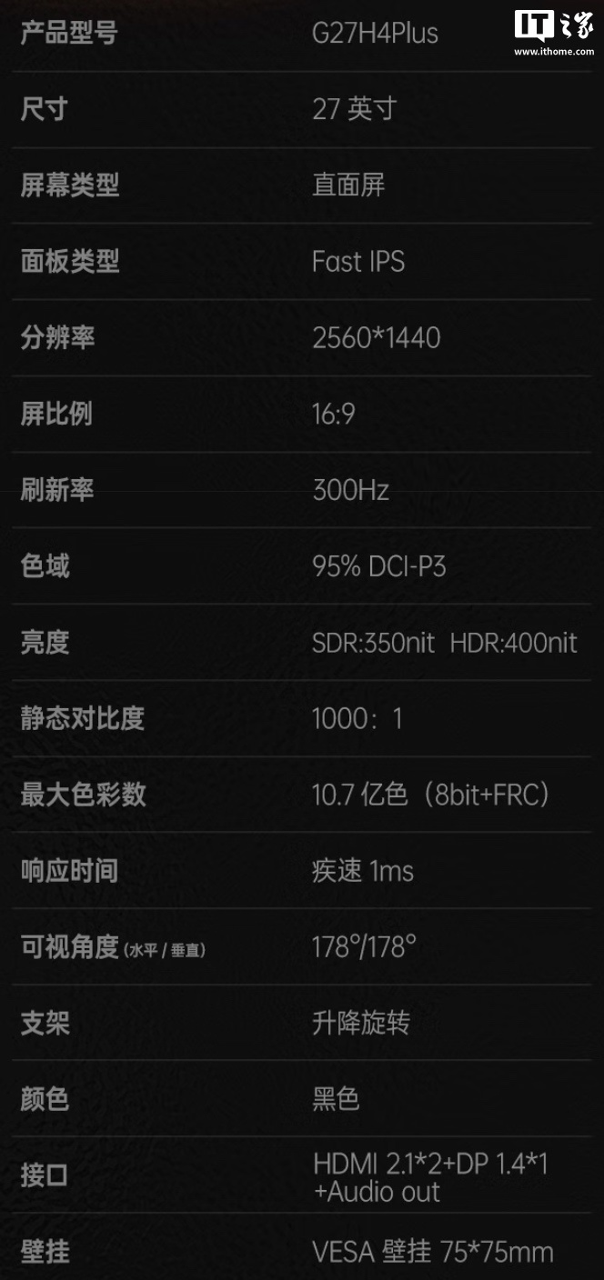 据介绍,该机配备一块 2560x1440 分辨率 300Hz Fast IPS 面板,响应速度 1ms,支持 400 尼特亮度,静态对比度 1000:1,支持 10-Bit 色彩(8-Bit + FRC),覆盖 95% DCI-P3 色域。