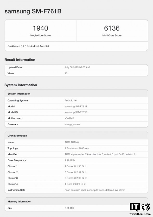 在性能方面,Galaxy Z Flip7 FE 在 Geekbench 的单核测试中得分为 1940 分,多核测试得分为 6136 分。此外,该设备还将预装 Android 16 系统,并搭配三星的 One UI 8 界面。
