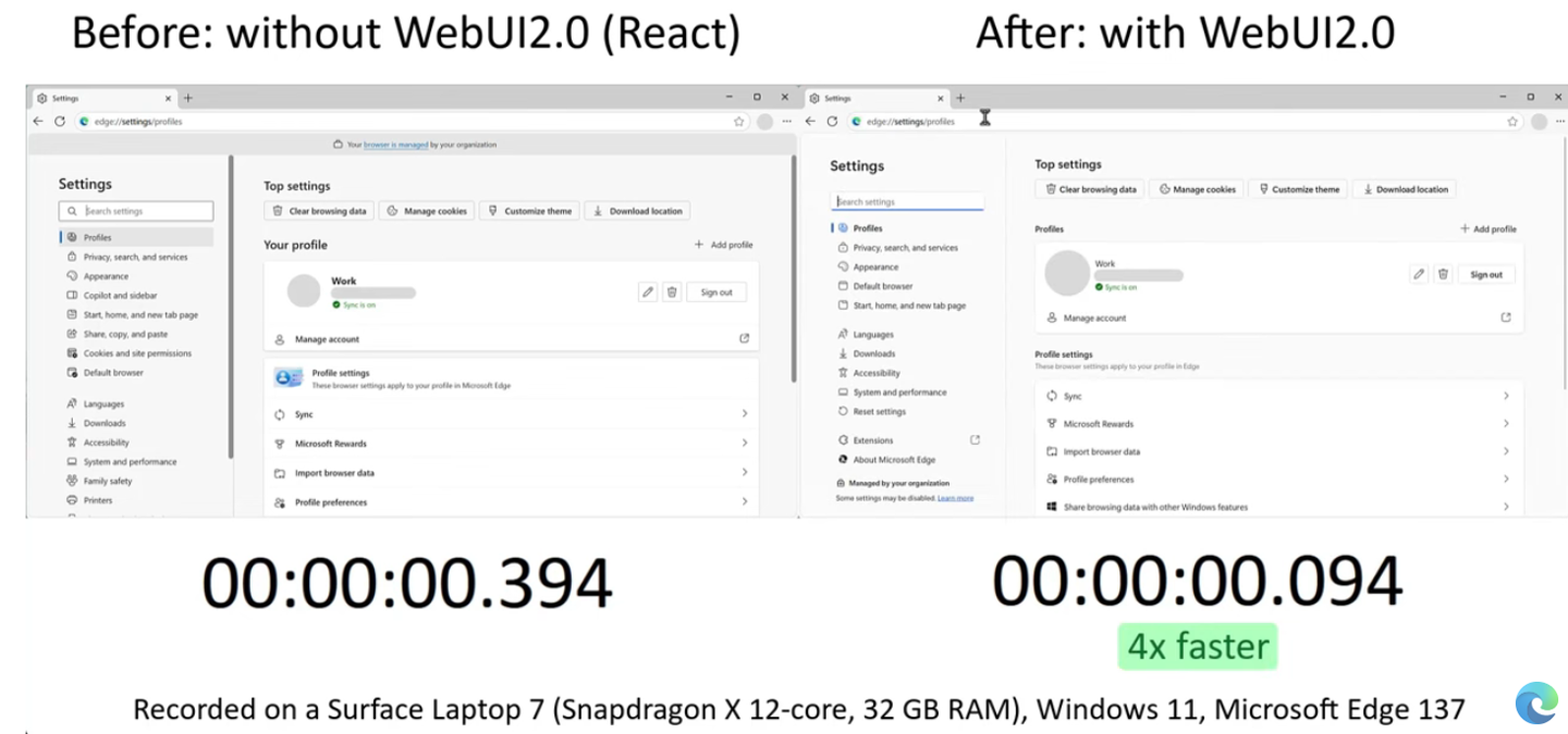 微软表示,行业研究显示,首屏内容加载等待时间超过 300 至 400 毫秒会显著影响用户满意度。通过达成这一关键阈值,Edge 将确保最常用的浏览器功能几乎即时出现,让用户更快地与内容互动。
