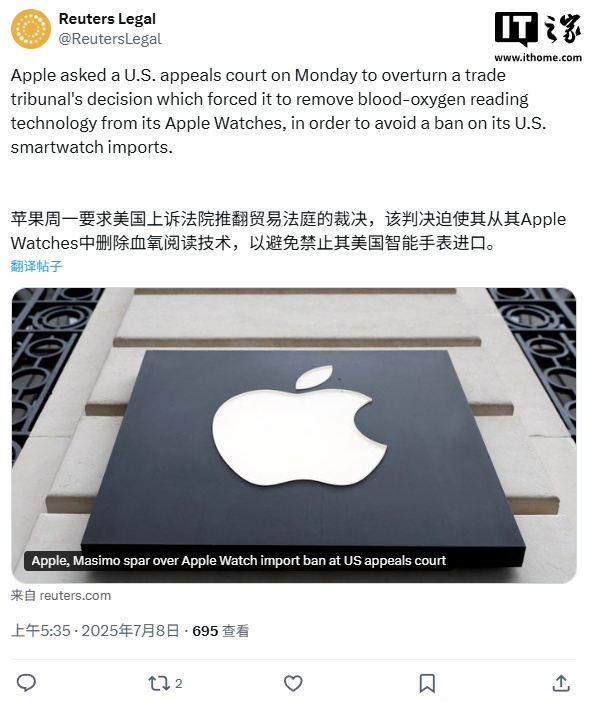 IT之家 7 月 8 日消息,路透社今日报道称,苹果公司当地时间周一于美国联邦巡回上诉法院就 Apple Watch 进口禁令提出上诉,要求推翻美国国际贸易委员会(ITC)2023 年底作出的裁决。