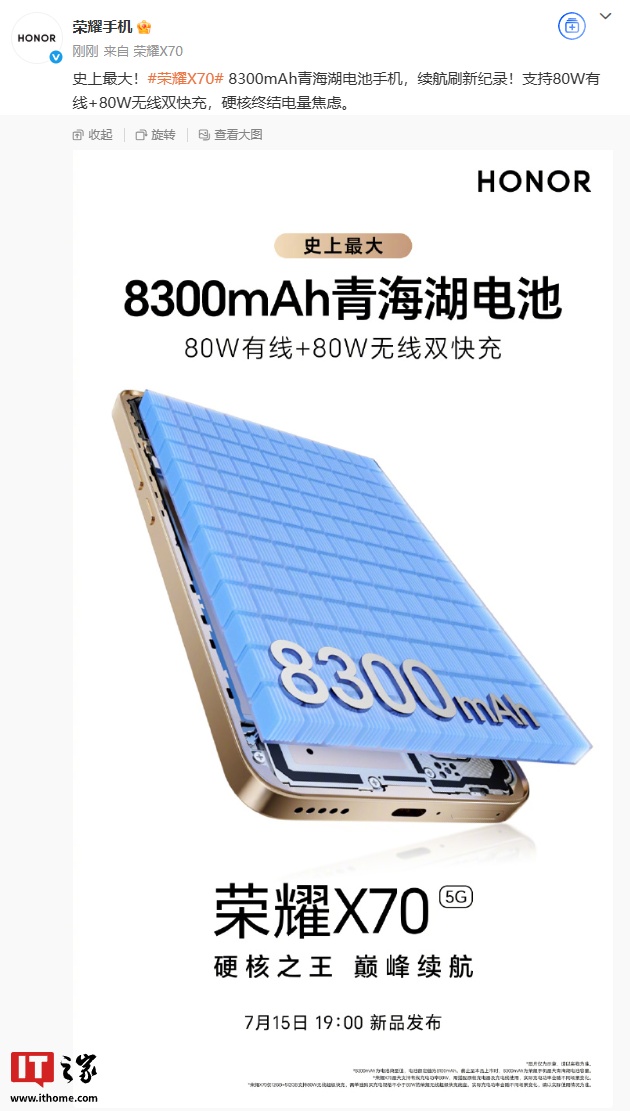 IT之家 7 月 8 日消息,荣耀手机官方刚刚宣布,荣耀 X70 将配备“史上最大”8300mAh 青海湖电池、支持 80W 有线 + 80W 无线双快充,号称“硬核终结电量焦虑”。