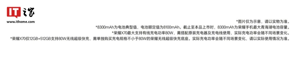 官方预热海报小字显示,荣耀 X70 手机最大支持有线充电功率 80W,需要搭配原装充电器及充电线使用,同时仅 12GB+512GB 支持 80W 无线快充。