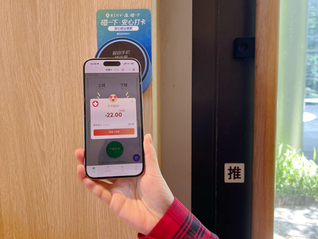 兼职咖啡师拿手机「碰一下」墙上的小蓝环,当天兼职的上下班时间便清晰显示在手机屏幕上,工资直接转到了其零工账户。整个过程十分流畅,耗时不过数秒。
