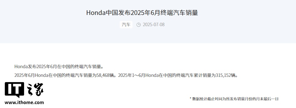 IT之家 7 月 8 日消息,本田中国刚刚公布了最新的 2025 年 6 月终端汽车销量数据 ——58,468 辆。今年 1~6 月本田在中国的终端汽车累计销量为 315,152 辆。