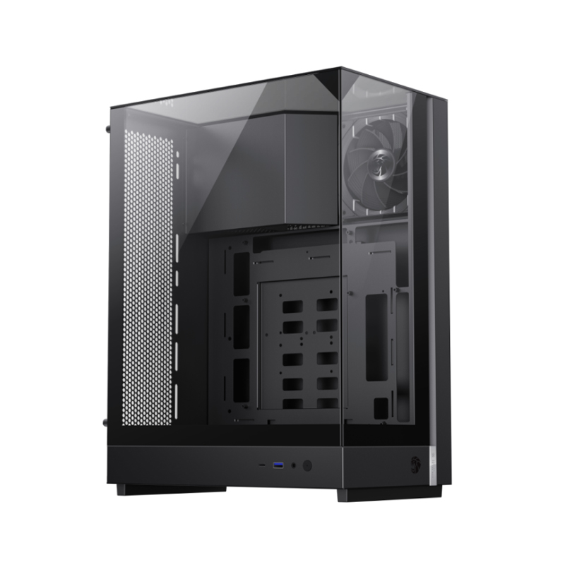 游戏帝国 T20 机箱在右侧板和底板处各预装一颗 120mm ARGB 反叶风扇,其前置 I/O 面板位于左侧底部,提供了 1 个 USB-C 10Gbps、1 个 USB-A 5Gbps、1 个二合一音频插孔和开机键。