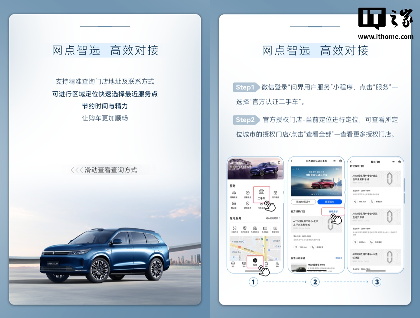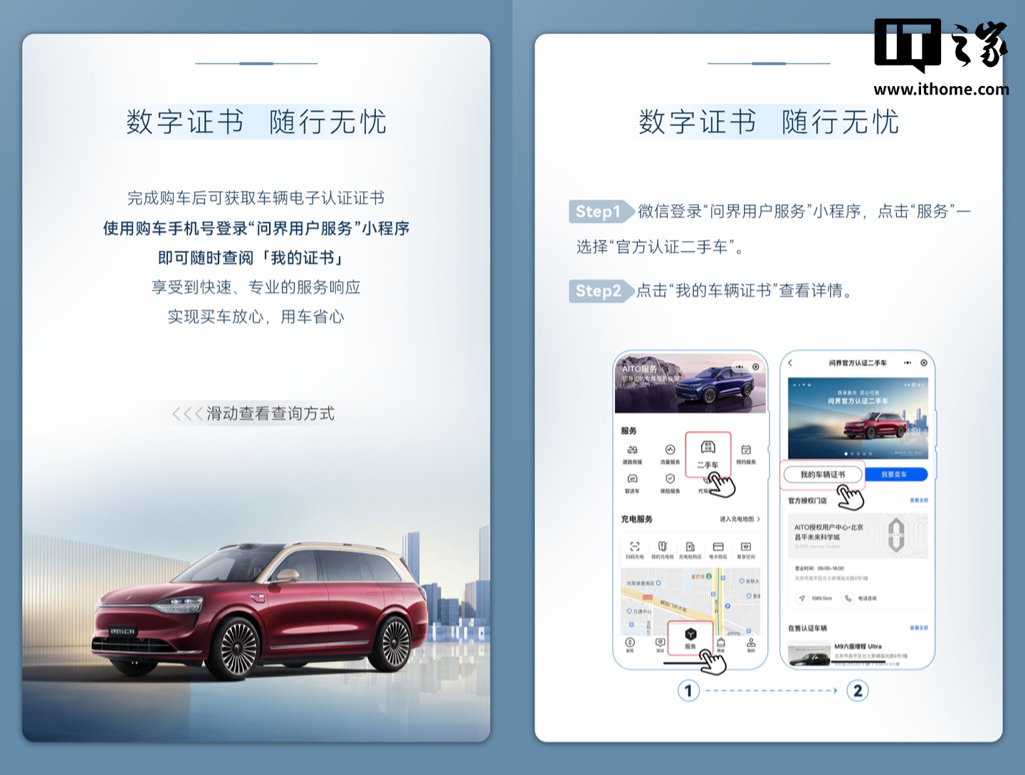 IT之家从问界汽车获悉,新功能还支持精准查询门店地址及联系方式,可进行区域定位快速选择最近服务点,方便用户购车。用户完成购车后可获取车辆电子认证证书,使用购车手机号登录“问界用户服务”小程序,支持随时查阅「我的证书」。