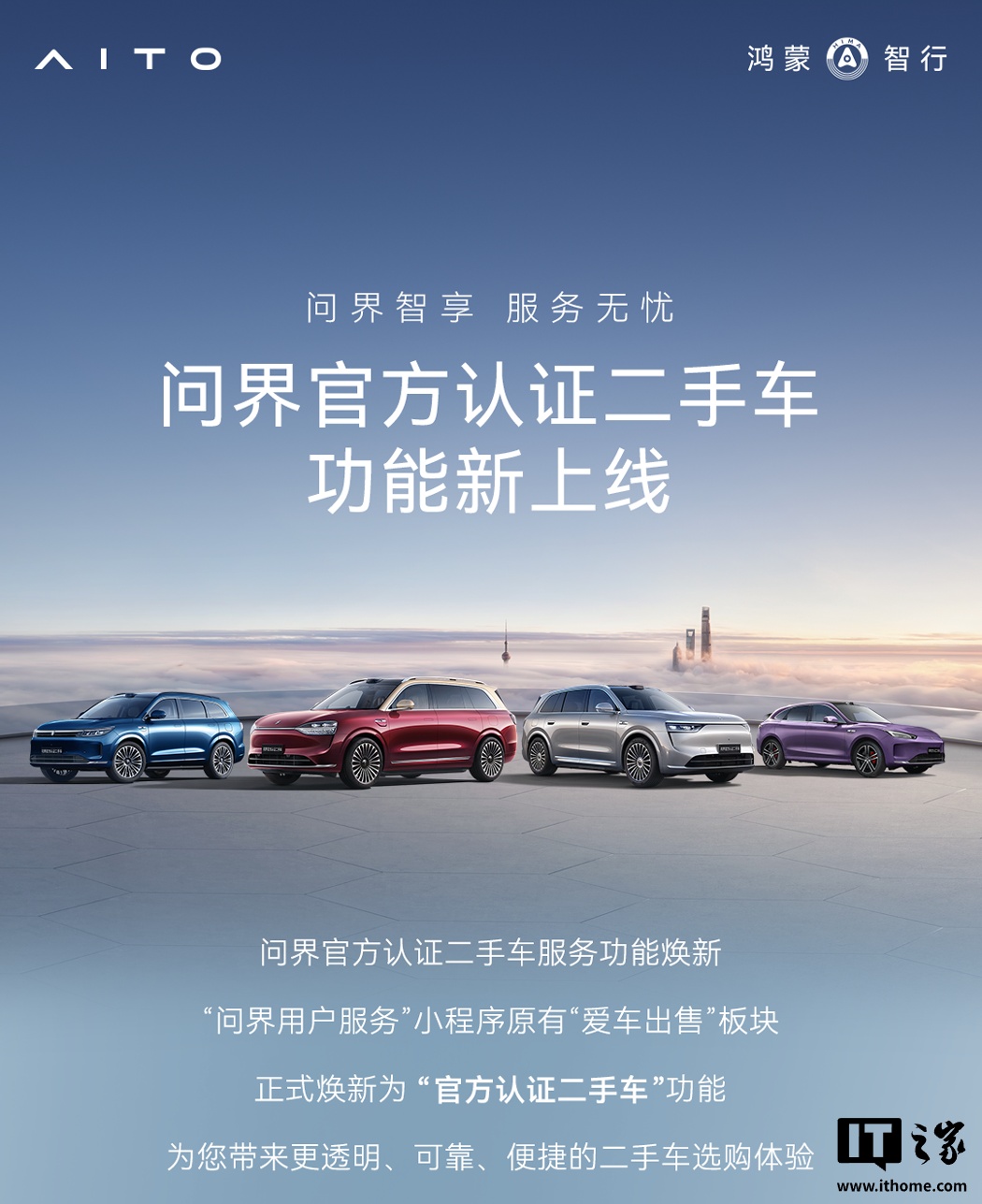IT之家 7 月 8 日消息,问界汽车官方今日发文宣布:问界官方认证二手车服务功能焕新,“问界用户服务”小程序原有“爱车出售”板块,正式焕新为“官方认证二手车”功能。