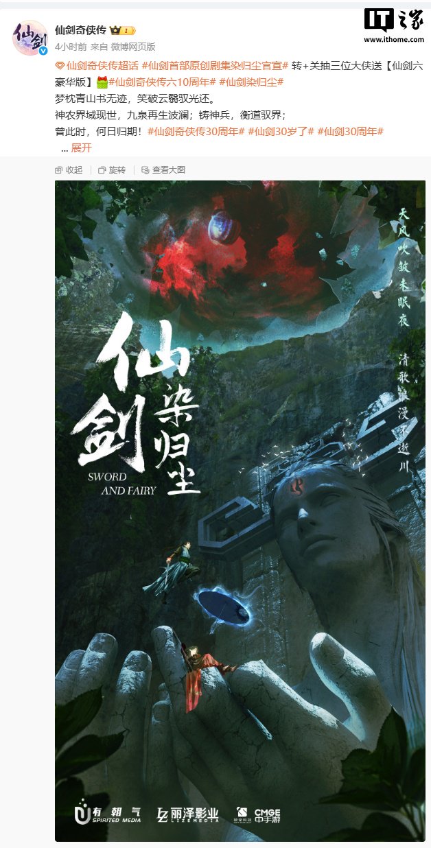 IT之家 7 月 8 日消息,在《仙剑奇侠传》系列 IP 30 周年纪念日到来之际,官方公布该系列 IP 将推出原创真人剧集《仙剑染归尘》。