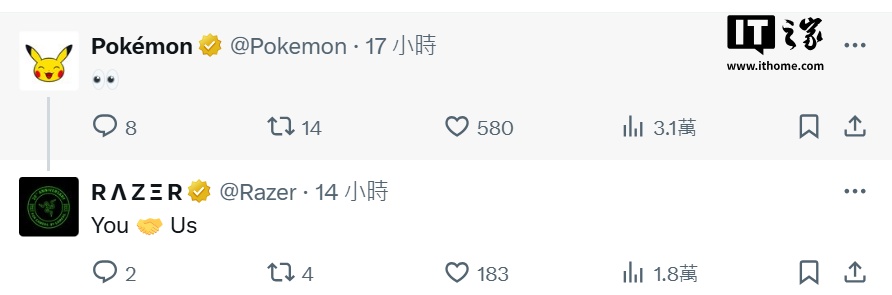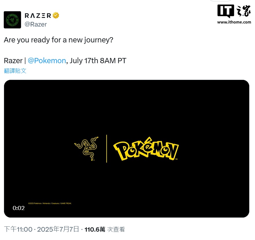 IT之家 7 月 8 日消息,雷蛇昨日于 X 平台发文,宣布将与宝可梦展开全新联动,7 月 17 日上午 8 点(太平洋时间)(北京时间 7 月 17 日 23 点)公布联动详情。