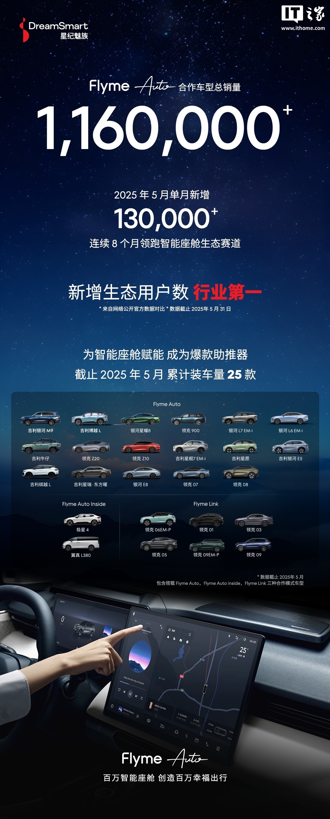 星纪魅族曾在 6 月透露,Flyme Auto 合作车型总销量达到 1167651 辆,连续 8 个月新增用户数位列行业第一。