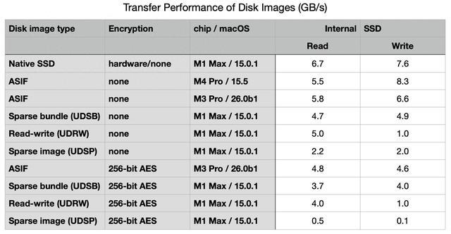 在一台配备 M3 Pro 的 MacBook Pro 上,100 GB 的 ASIF 映像在读取时达到了 5.8 GB/s,写入时达到了 6.6 GB/s。即使启用加密,传输速度仍然很高,分别为 4.8 GB/s 和 4.6 GB/s。在一台配备 M4 Pro 的 Mac mini 上,甚至测量到了超过 8 GB/s 的写入速度。