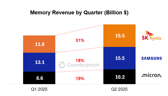 IT之家 7 月 9 日消息,分析机构 Counterpoint 在当地时间昨日的新闻稿中指出,在 DRAM 内存 + NAND 闪存的整体存储营收方面,SK 海力士在今年二季度实现了 31% 的显著环比增长,以 155 亿美元(IT之家注:现汇率约合 1112.92 亿元人民币)的水平追上了传统领先者三星电子。