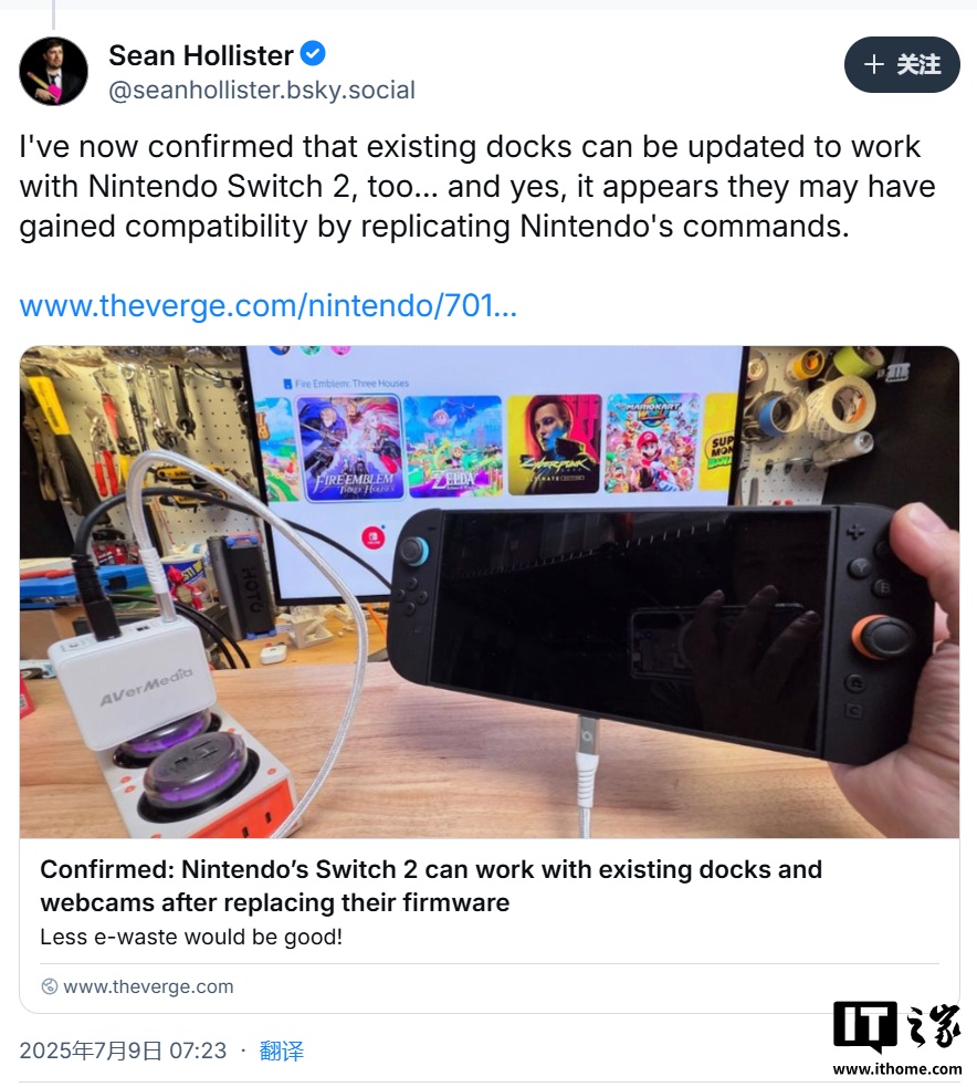 IT之家 7 月 9 日消息,科技媒体 The Verge 今日发文,称任天堂 Switch 2 游戏机的 USB-C 接口具有独占协议,导致第三方底座几乎无法兼容该游戏机。