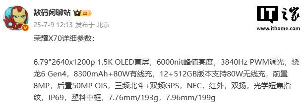 IT之家 7 月 9 日消息,博主 @数码闲聊站 今日曝光荣耀 X70 的详细参数,这款新机将于 7 月 15 日 19:00 发布。