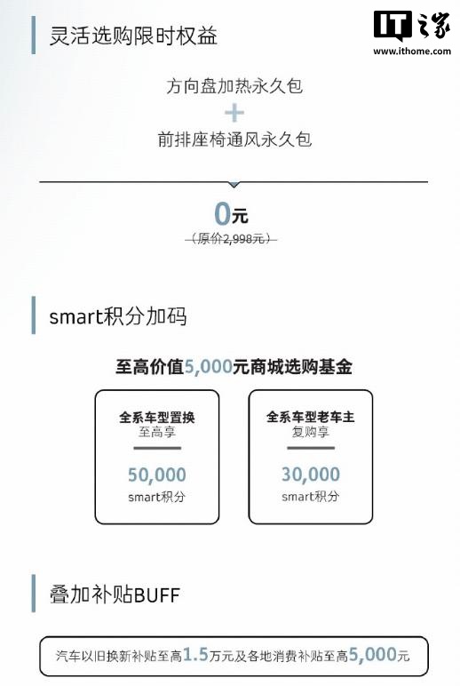 IT之家注意到,smart 中国目前正对现款 smart 精灵#3 推出限时一口价促销活动,活动持续至 2025 年 7 月 31 日。型动标准版限时售价为 15.69 万元,型动长续航版为 17.69 万元,型动四驱版为 19.99 万元,均低于原指导价。此外,购车用户还可享受 3 年 0 息金融方案、方向盘加热与前排座椅通风永久包、最高 5000 元商城选购基金及最高 1.5 万元置换补贴等多项优惠政策。