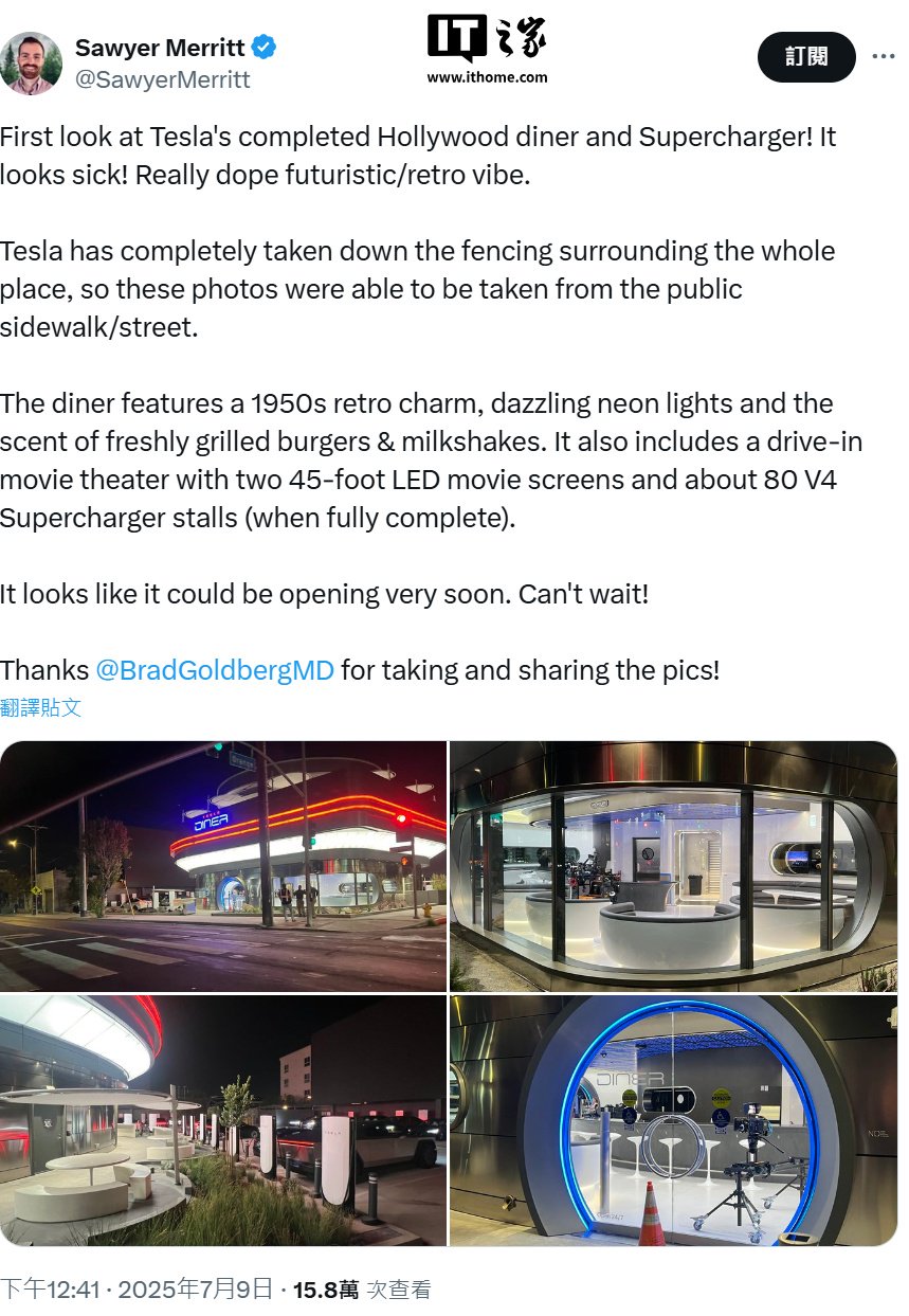 IT之家 7 月 9 日消息,科技博主 Sawyer Merritt 今日于 X 平台发文称,首家特斯拉餐厅目前已经拆除围挡并亮灯,进入最后的收尾阶段,该餐厅设计复古,充满霓虹灯、钢铁等赛博元素。