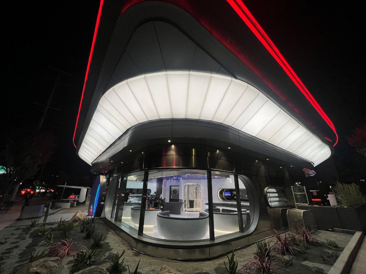 该餐厅不仅提供餐饮服务,外部还设有汽车影院,影院有两块 45 英尺(约 13.72 米)高的 LED 屏幕和 80 个 V4 超级充电桩,方便车主在用餐的同时为车辆充电。
