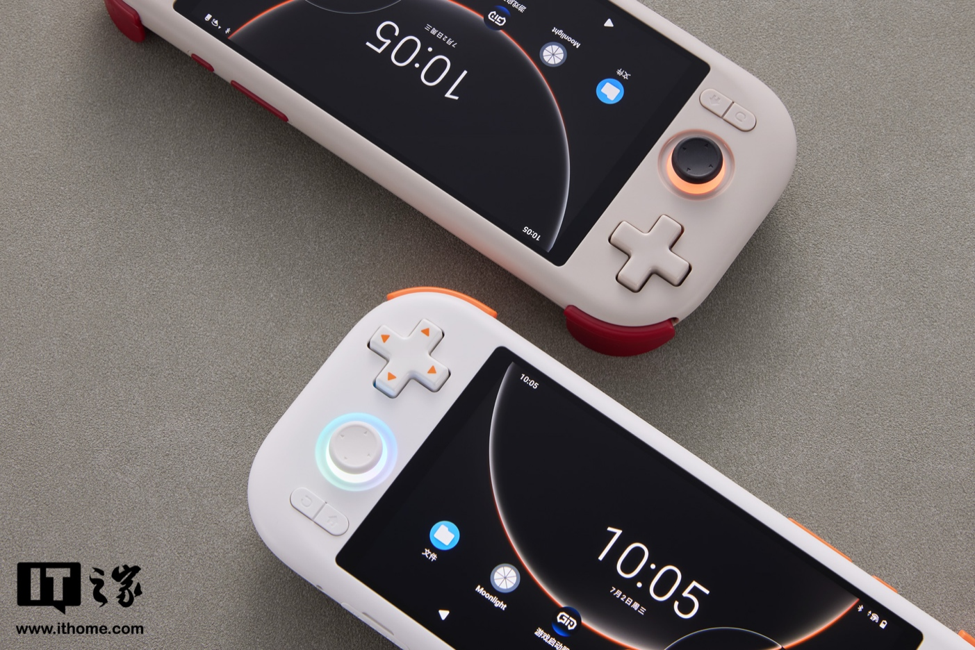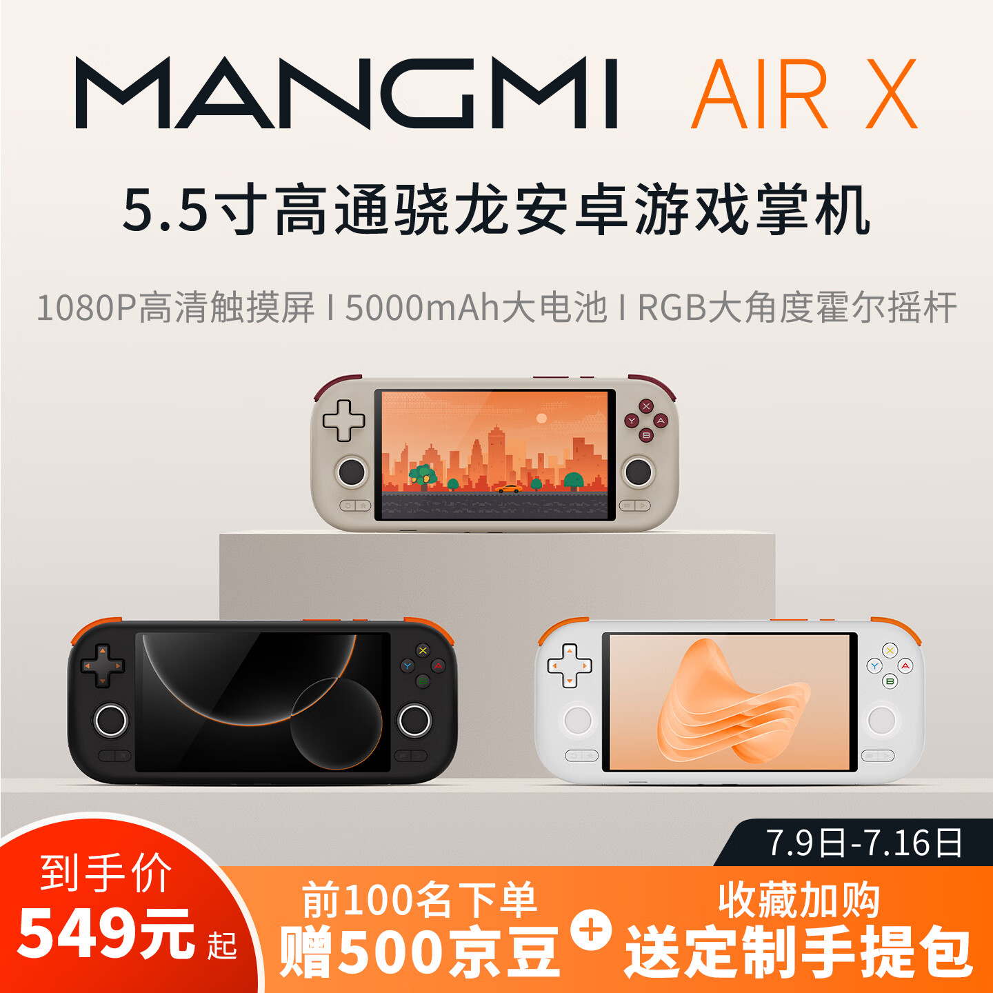 作为一款安卓掌机产品,MANGMI AIR X 外观采用极简设计,IT之家拿到的为白色和复古 GB 配色(其他方面还有黑色配色可选),其外壳采用亲肤材质,在扳机键、方向键采用了橙色撞色设计,颇有种活泼感,正面匹配一块 5.5 英寸 1920x1080 分辨率 60Hz 16:9 比例 IPS LCD 面板,覆盖 110% sRGB 色域。