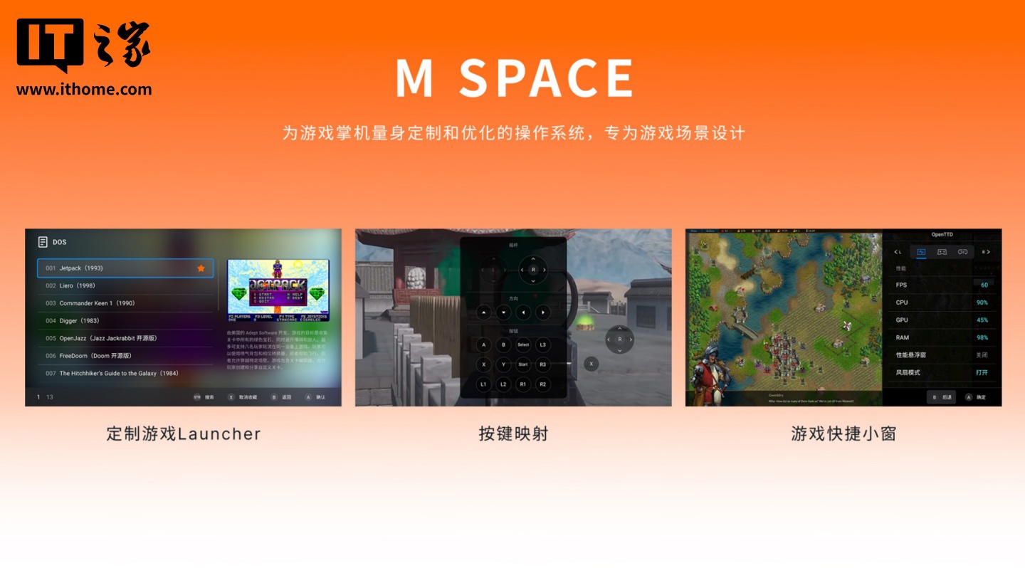 该机基于安卓 14 系统,预装多款安卓模拟器,搭载了芒米科技深度定制的 M SPACE 电竞定制 UI。在这套系统下,绝大多数的日常使用都可以在横屏下完成,避免了进入游戏时频繁切换方向带来的不便。