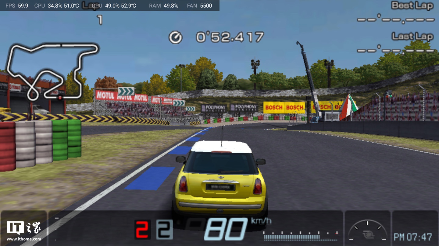 以模拟 PSP 游戏为例,IT之家使用预装的 PPSSPP 运行经典《GT 赛车》游戏,游戏在 1080P 画质增益情况下,全程帧率维持在 59-60 帧左右。