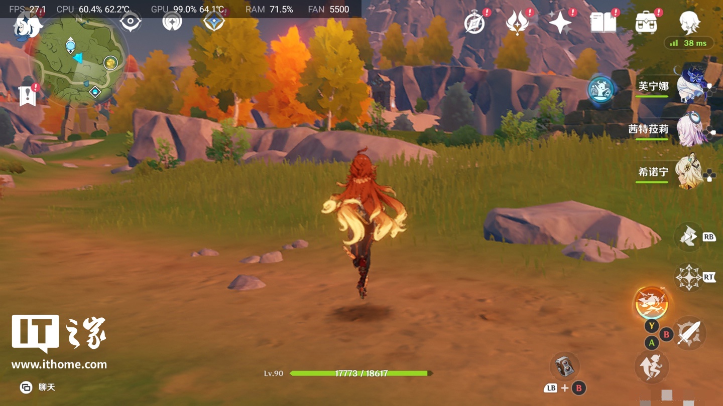 在《原神》方面,MANGMI AIR X 的霍尔原生手柄摇杆完美适配游戏,可以精准控制游戏角色移动。运行效能方面,游戏在低画质下,平均帧率大约为 25 至 30 FPS。