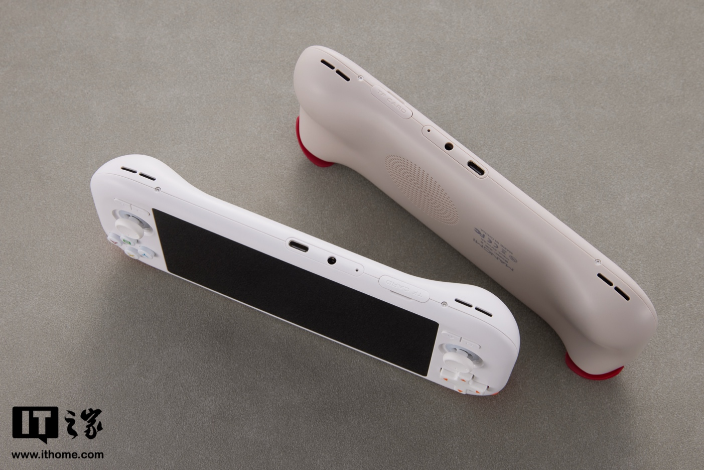 再来看看细节,该机顶部集成了电源键、音量键,最左侧则是主动散热风扇的出风口;机底为 TF 卡插槽、3.5mm 音频接口、USB-C 接口和双扬声器;机身背面简洁,一侧为厂商标志,一侧为进风口开孔。