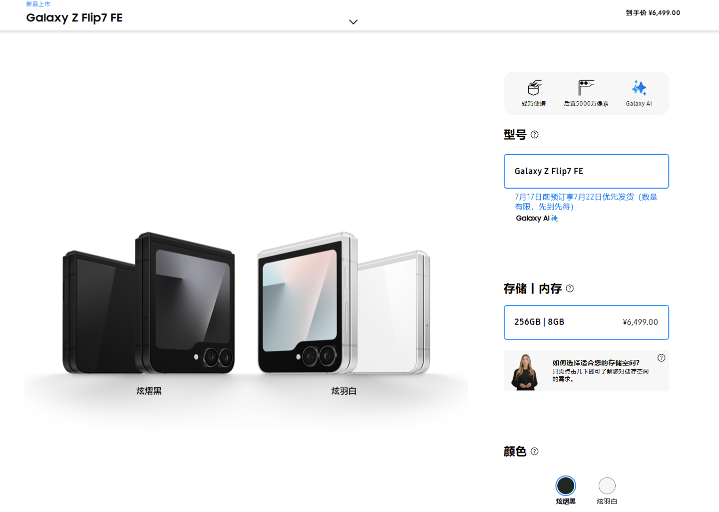 Galaxy Z Flip7 FE 国行提供 8GB 内存 + 256GB 存储一个版本,售价 6499 元,即日起开启预订,7 月 17 日前预订享 7 月 22 日优先发货(数量有限,先到先得)。