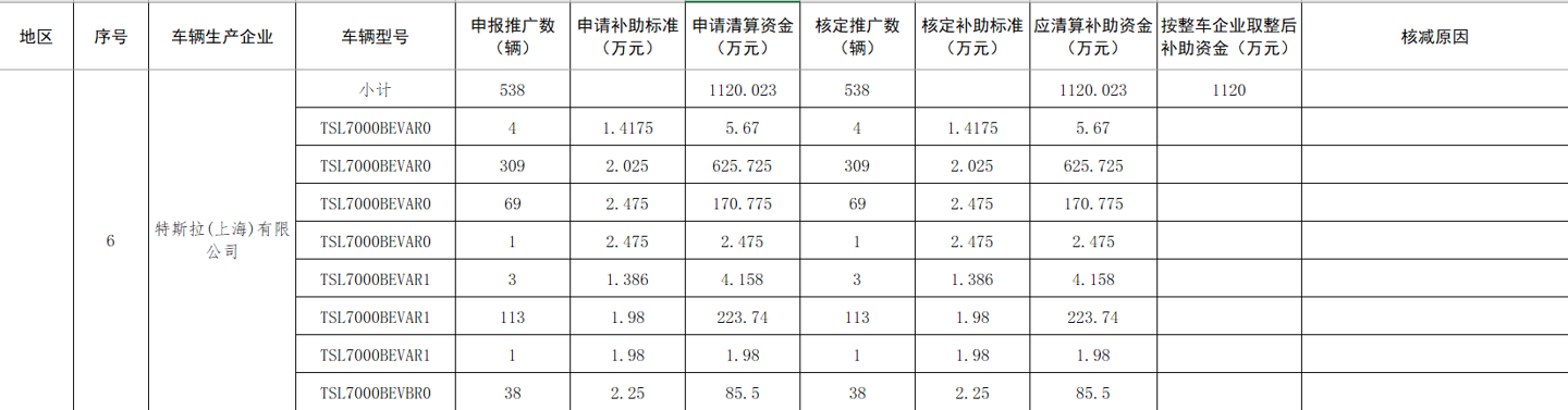 IT之家注意到,特斯拉在 2020 年首次参与国内新能源汽车推广应用补贴,该公司申报推广的车辆没有出现核减情况,当年补助资金 1120 万元。