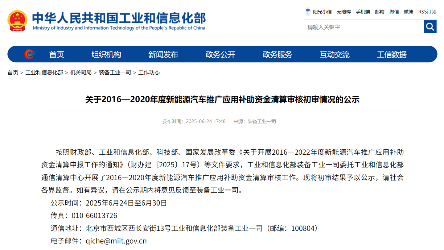 IT之家 7 月 10 日消息,工信部 6 月底发布《关于 2016—2020 年度新能源汽车推广应用补助资金清算审核初审情况的公示》(下称“《公示》”),开展了 2016—2020 年度新能源汽车推广应用补助资金清算审核工作。
