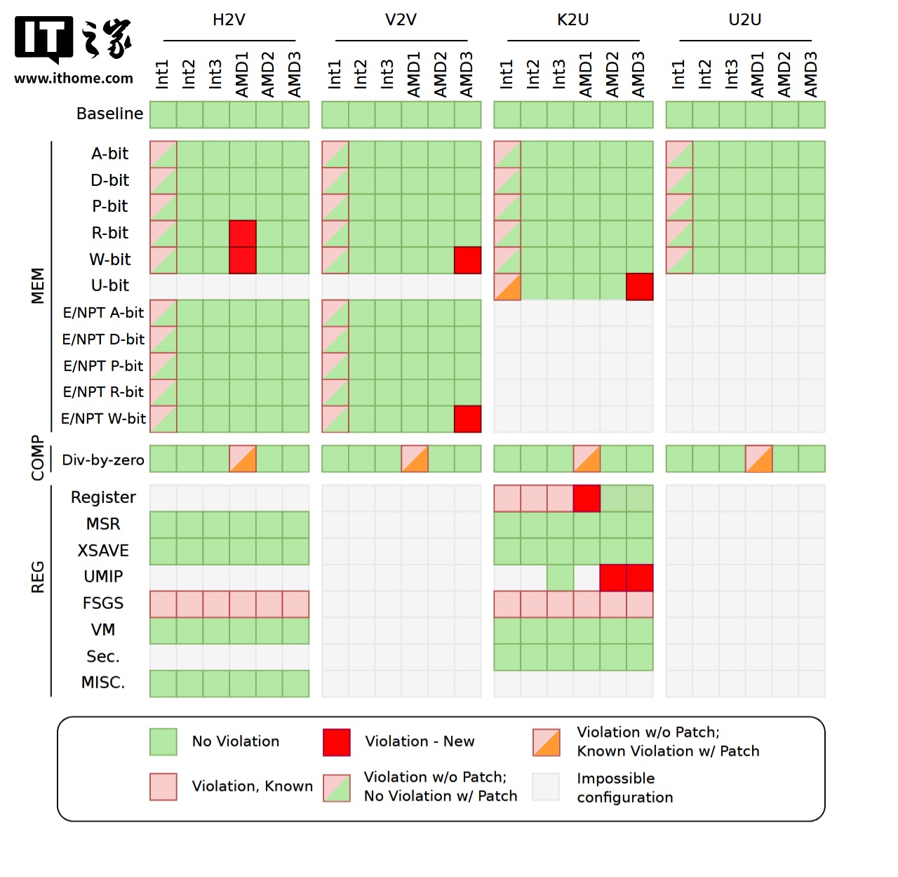 团队定制了相关测试框架,在 AMD Zen 3 和 Zen 4 芯片上发现了新的泄漏向量,并证实了熔断(Meltdown)和微架构数据采样(MDS)等几个已知漏洞。