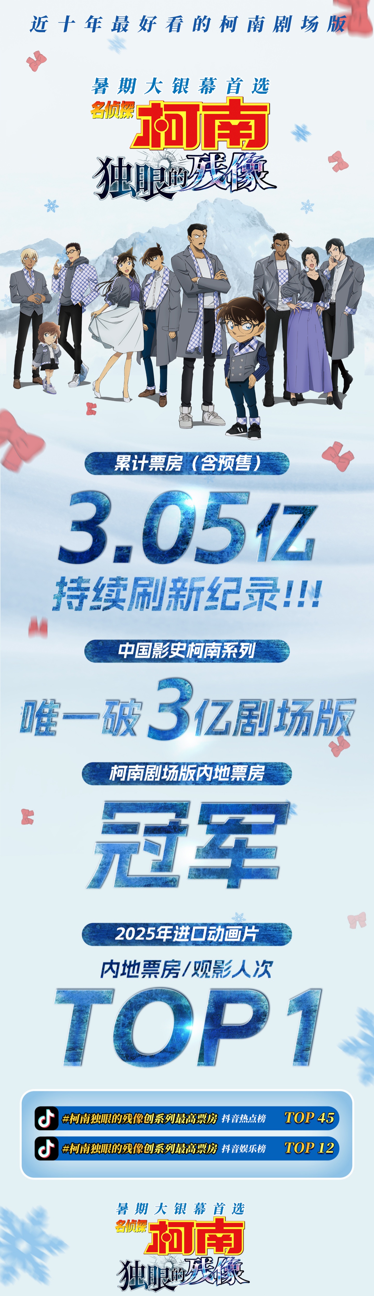 IT之家 7 月 10 日消息,电影《名侦探柯南:独眼的残像》官方微博昨日发文宣布,影片成为中国影史柯南系列唯一破 3 亿剧场版,获年度进口动画电影内地票房、观影人次第一。