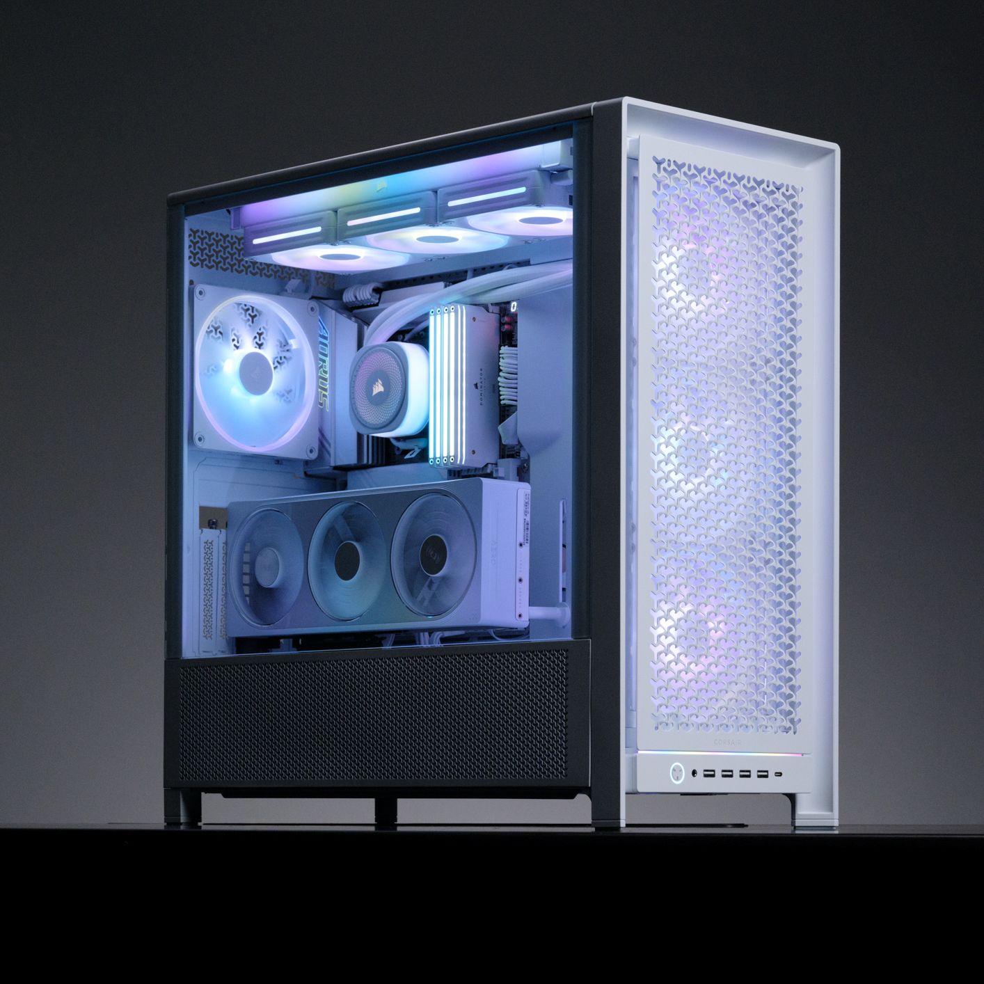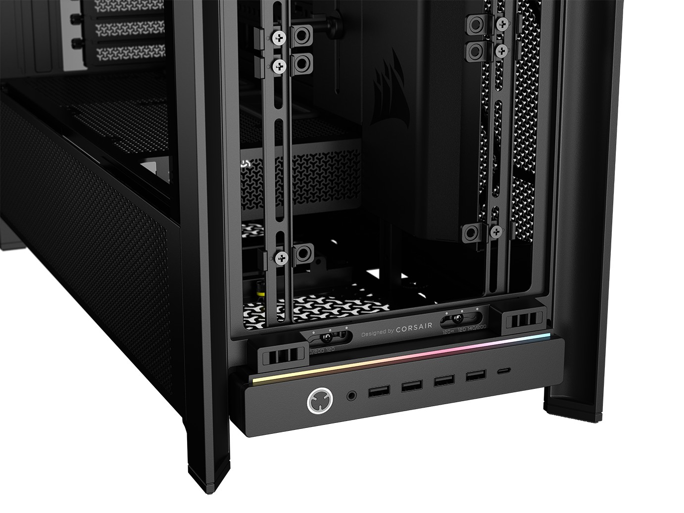 该机箱预装四颗支持菊链式连接的 RS140 风扇,可通过另购转接卡实现显卡竖装。其前置 I/O 面板位于正面下方,拥有 ARGB 光条,提供了 1 个 USB-C 20Gbps、4 个 USB-A 5Gbps、1 个耳麦组合插孔和电源按键。