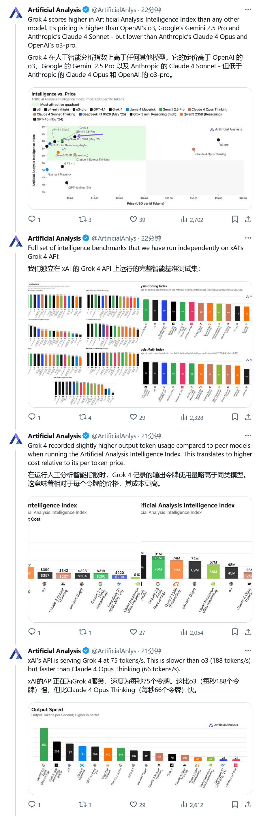 根据 Artificial Analysis 公布的跑分结果,Grok 4 的智能指数为 73,作为对比,OpenAI 的 o3 模型为 70,谷歌 Gemini 2.5 Pro 模型为 70,Deepseek R1-0528 模型为 68 分,Anthropic Claude 4 Opus 模型为 64 分。