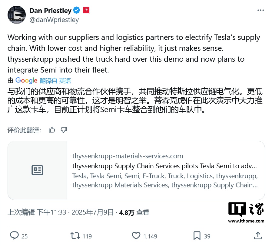 随后特斯拉 Semi 工程总监 Dan Priestley 在 X 平台发布推文,表示特斯拉将继续帮助像 thyssenkrupp 这样的供应商,将 Semi 卡车纳入他们的运营中。