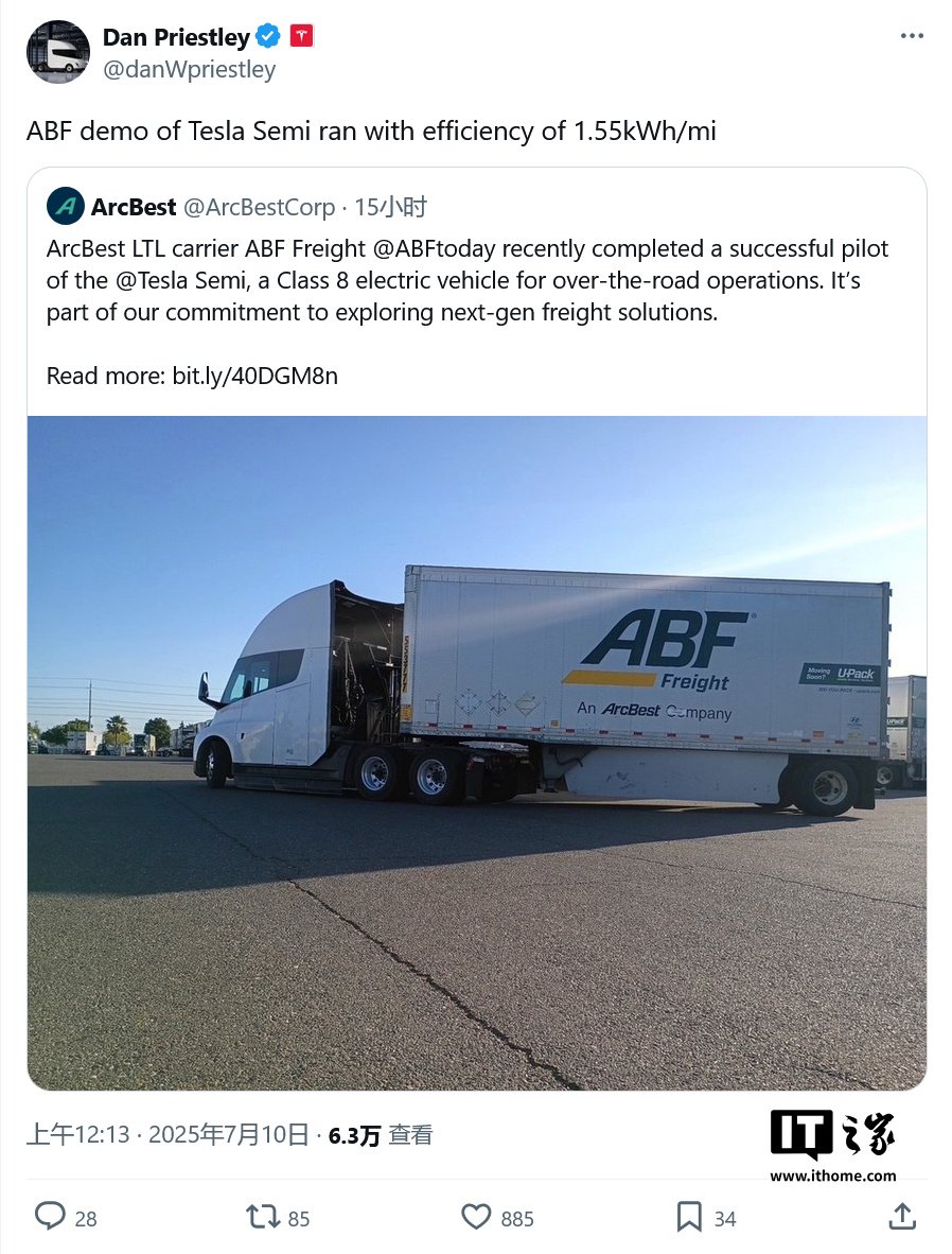 ArcBest 公司的 ABF Freight 部门也完成了为期三周的特斯拉 Semi 卡车试点项目,覆盖了 4494 英里(约 7232.39 公里),平均每天行驶 321 英里。