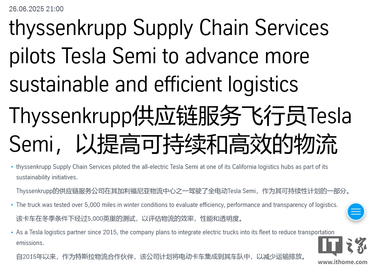供应链服务公司 thyssenkrupp 在其加州的物流中心,对特斯拉 Semi 电动卡车展开了为期 3 周的试点测试,在冬季环境下运行超 5000 英里(IT之家注:约 8046.72 公里)。