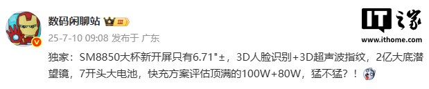 IT之家 7 月 10 日消息,博主 @数码闲聊站 今日曝光某厂 SM8850(第二代骁龙 8 至尊版)“大杯”新机的部分规格,预计为荣耀 Magic8 Pro。